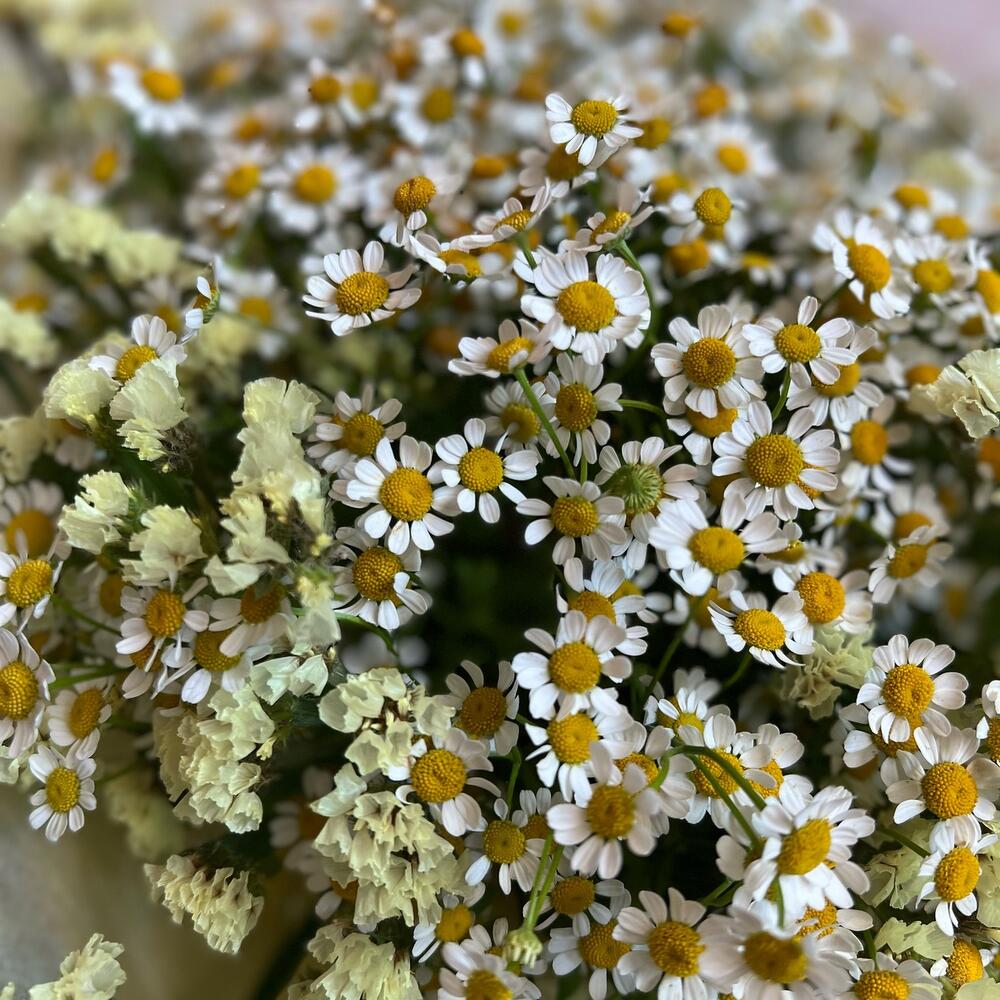 Танацетум – 29 шт.Статица – 4 шт.декоративная упаковка – 1 шт.Атласная лента – 1 шт.