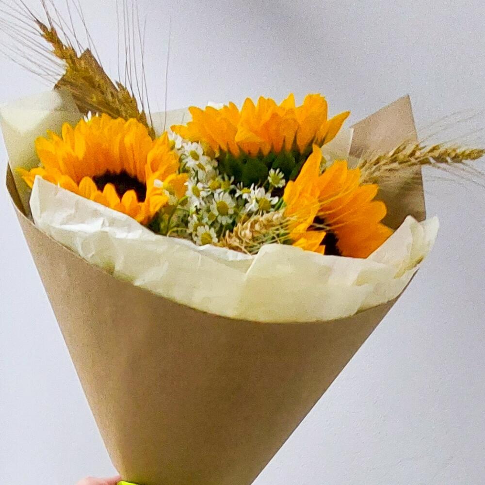 Лента атласная – 2 шт.Тишью – 1 шт.Подсолнух Голландский – 3 шт.Открыточка с вашими пожеланиями – 1 шт.бумага крафт – 1 шт.транспортировочная упаковка – 1 шт.пшеница натуральная – 5 шт.танацетум ромашка – 5 шт.
