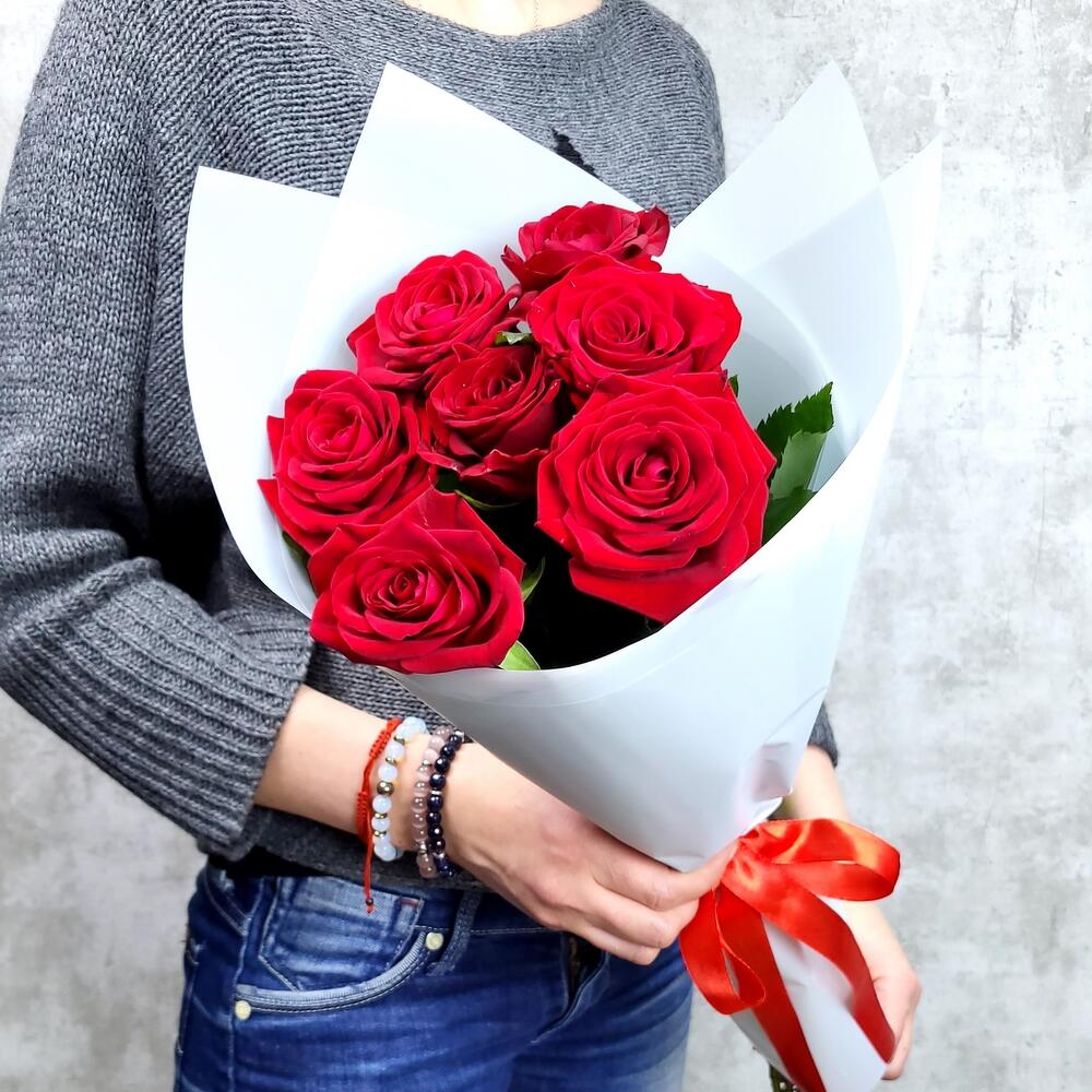 Роза красная 60 см – 7 шт.Упаковка – 1 шт.Лента – 1 шт.