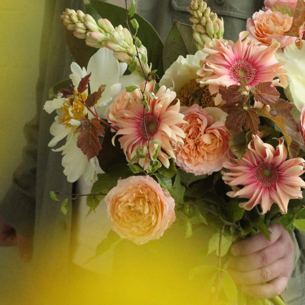 Лента – 1 шт.Пион – 3 шт.Роза кустовая пионовидная – 3 шт.тубироза – 2 шт.пузыреплодник – 3 шт.гербера кучерявая – 3 шт.зелень ветки – 3 шт.