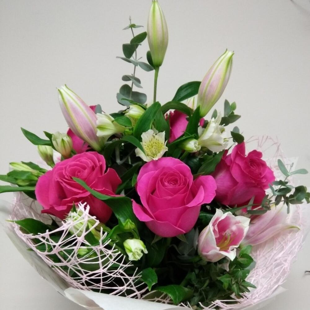 Роза Эквадор – 5 шт.Альстромерия – 3 шт.Лилия – 1 шт.декоративная зелень – 1 шт.Дизайнерская упаковка – 1 шт.