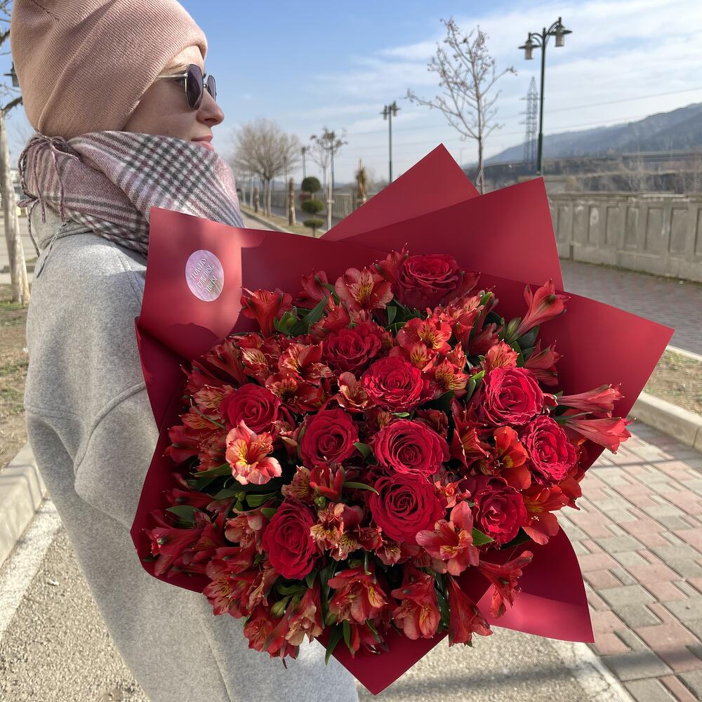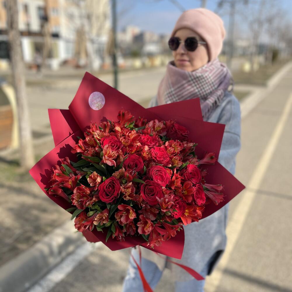 Представляем вашему вниманию авторский букет: потрясающую цветочную композицию, которая идеально подходит для любого случая. Этот букет тщательно создан из самых свежих и красивых роз и альстромерий, чтобы каждый лепесток пылал цветом и ароматом.