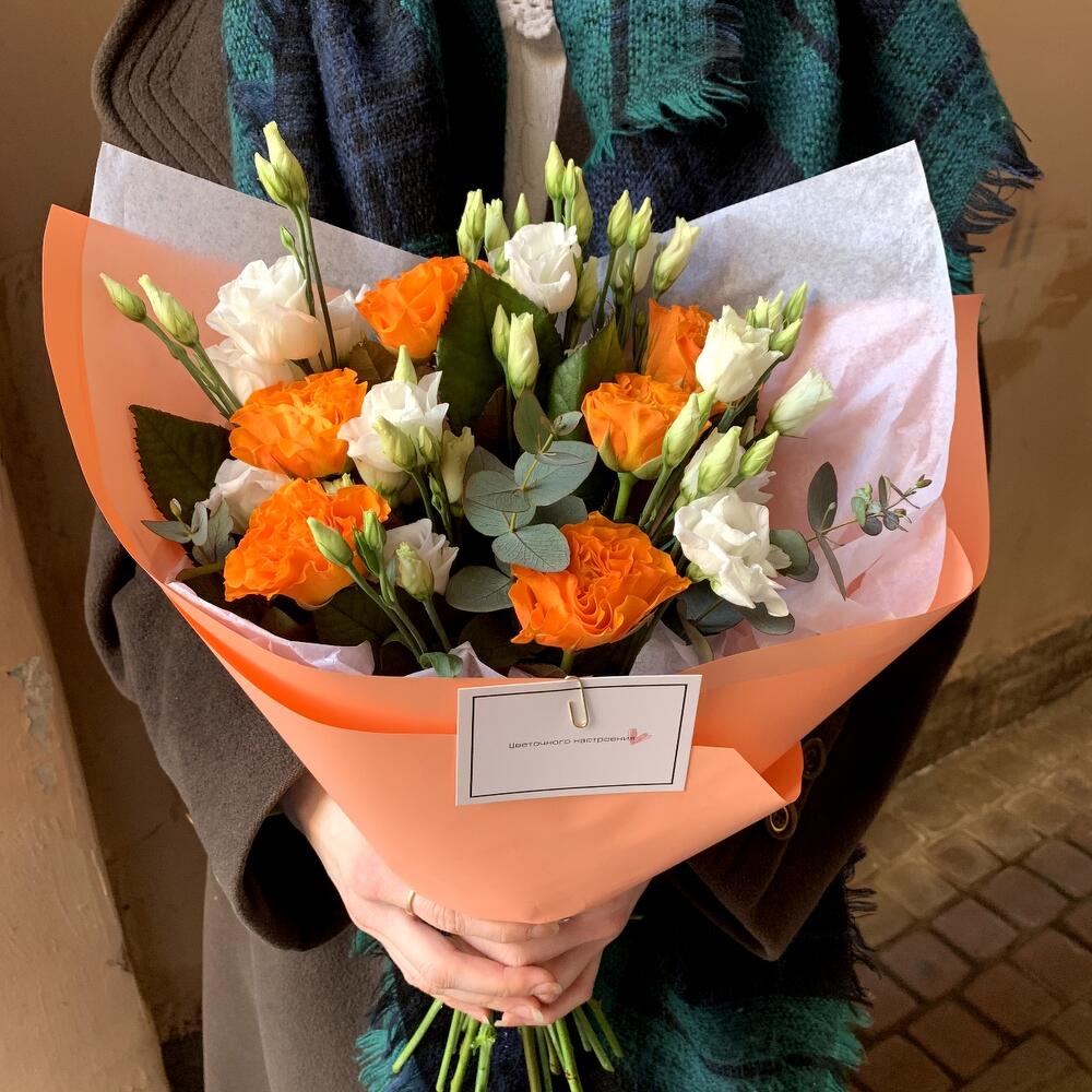 Эвкалипт – 1 шт.Лизиантус белый – 2 шт.Авторская упаковка – 1 шт.роза россия оранжевая – 7 шт.