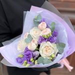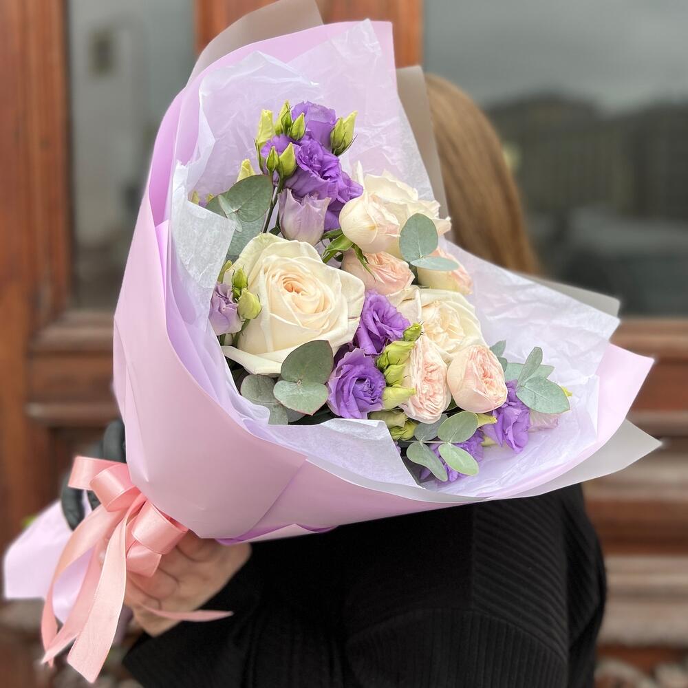 Эвкалипт – 3 шт.Лента атласная – 2 шт.Тишью – 2 шт.Пленка матовая – 3 шт.роза пионовидная вайт o’hara – 3 шт.роза мэнсфилд парк – 1 шт.эустома лавандовая махровая – 2 шт.