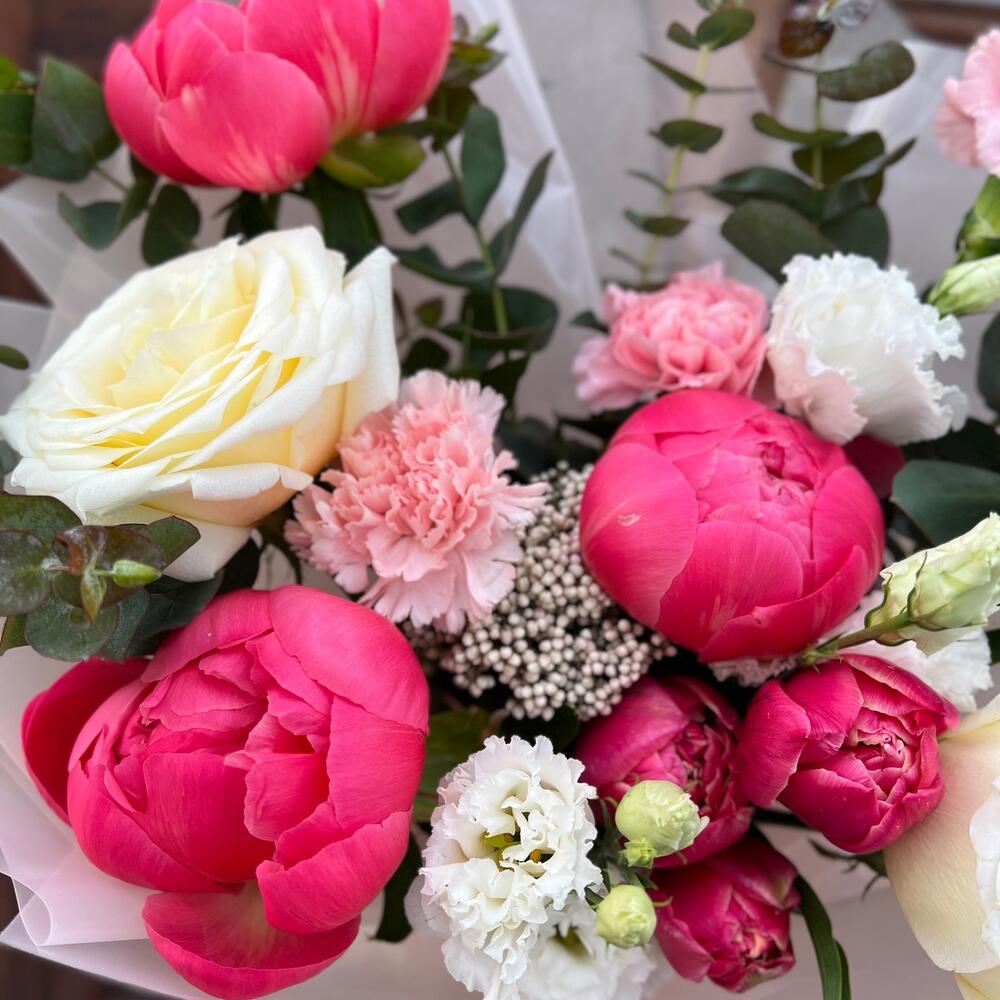 Категорий: Гвоздики, Лизиантусы, Пионовидные розы, Розы, Тюльпаны