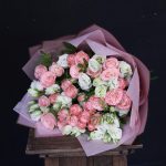 Эустома – 7 шт.Роза кустовая пионовидная мадам бомбастик – 10 шт.Фисташка – 2 шт.Тишью – 2 шт.Пленка дизайнерская – 2 шт.Лента атласная – 2 шт.