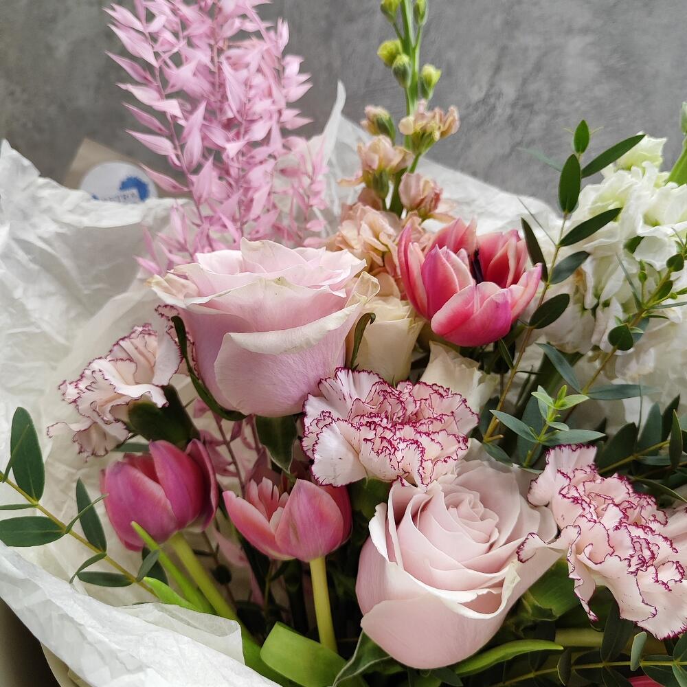 Тюльпан пионовидный – 7 шт.Роза – 3 шт.Роза кустовая – 2 шт.Гвоздика – 5 шт.Маттиола – 2 шт.Фисташка – 2 шт.Сухоцвет – 1 шт.Авторская упаковка – 1 шт.Атласная лента – 1 шт.
