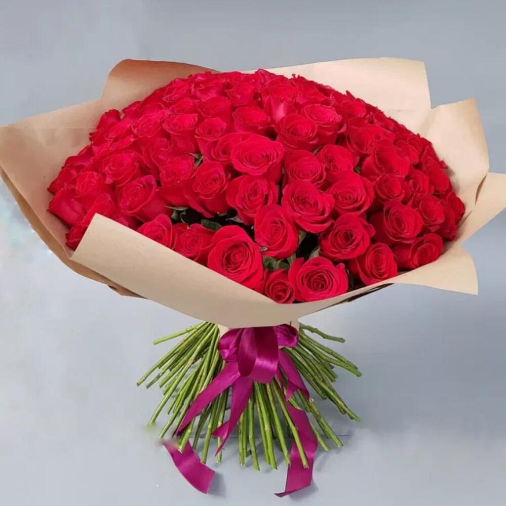 Роза красная 50 см – 101 шт.упаковка крафт-бумага – 1 шт.