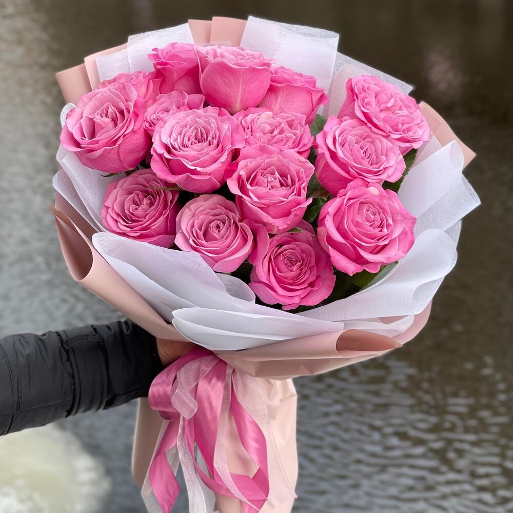 Лента – 2 шт.Роза одноголовая – 15 шт.Упаковка дизайнерская – 2 шт.