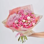 Пионовидная роза кустовая – 11 шт.пионы – 9 шт.гортензия розовая большая – 9 шт.Лента атласная – 2 шт.Упаковка дизайнерская – 2 шт.Кризал – 1 шт.инструкция по уходу за цветами – 1 шт.коробка переноска – 1 шт.