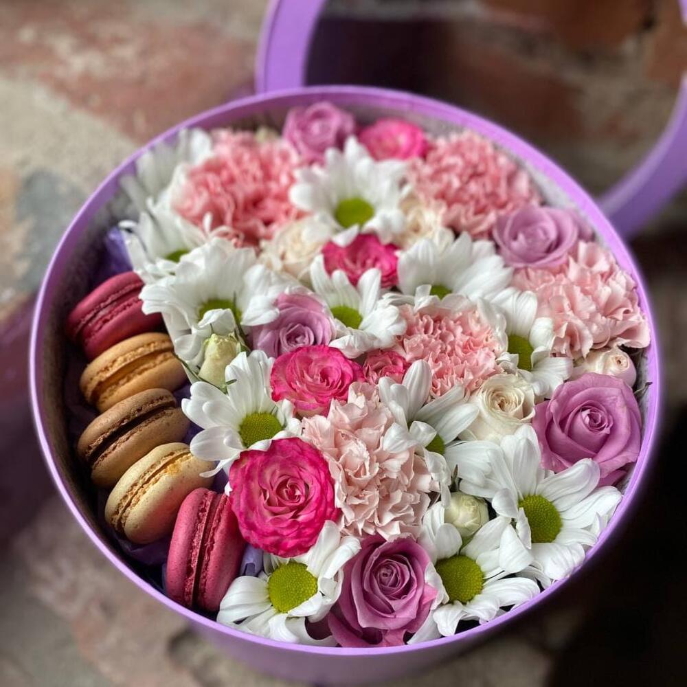 Букет из роз, хризантем, диантуса и макаронс в декоративной коробке “Сладкая встреча”