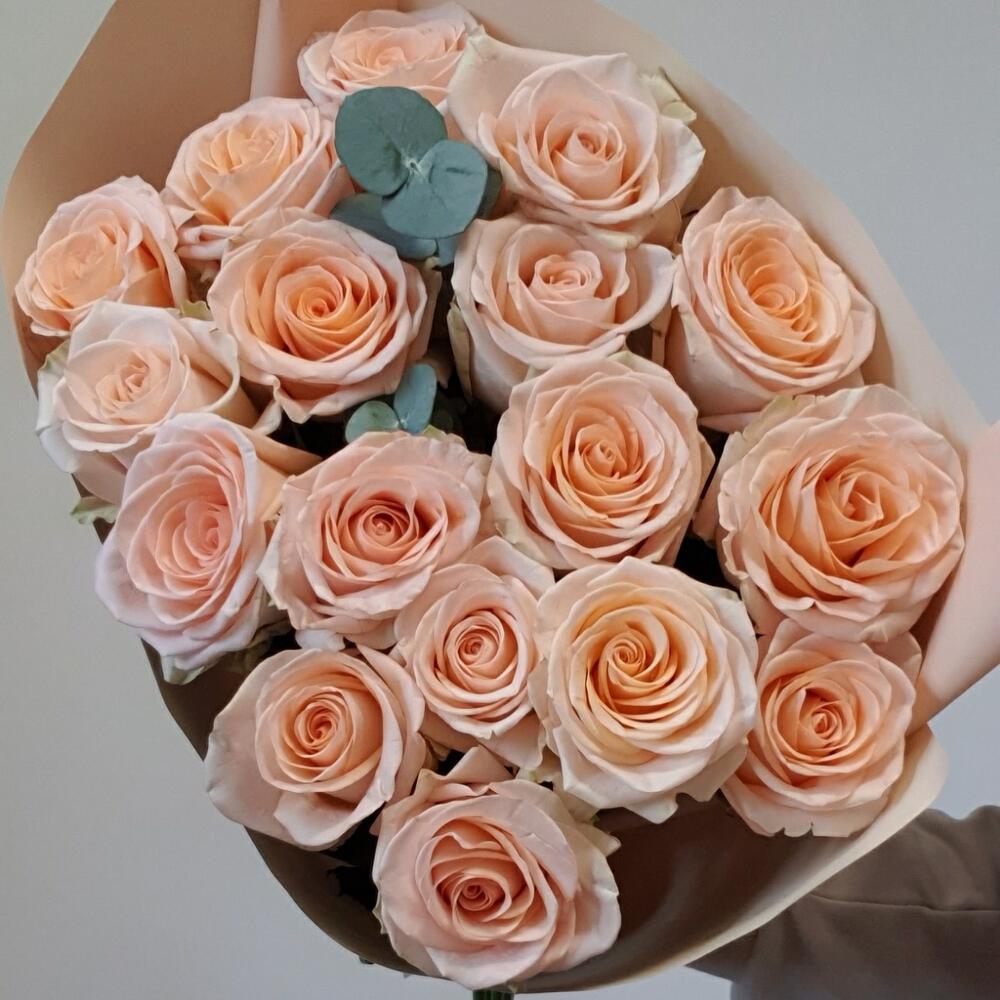 Эвкалипт – 1 шт.Упаковка – 2 шт.Лента атласная – 1 шт.Роза тиффани – 17 шт.