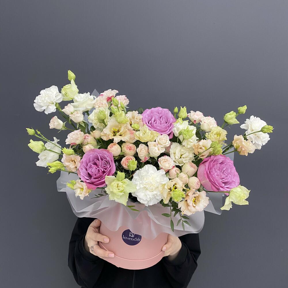 Альстромерии, Гвоздики, Кустовые розы, Лизиантусы, Розы, Хризантемы