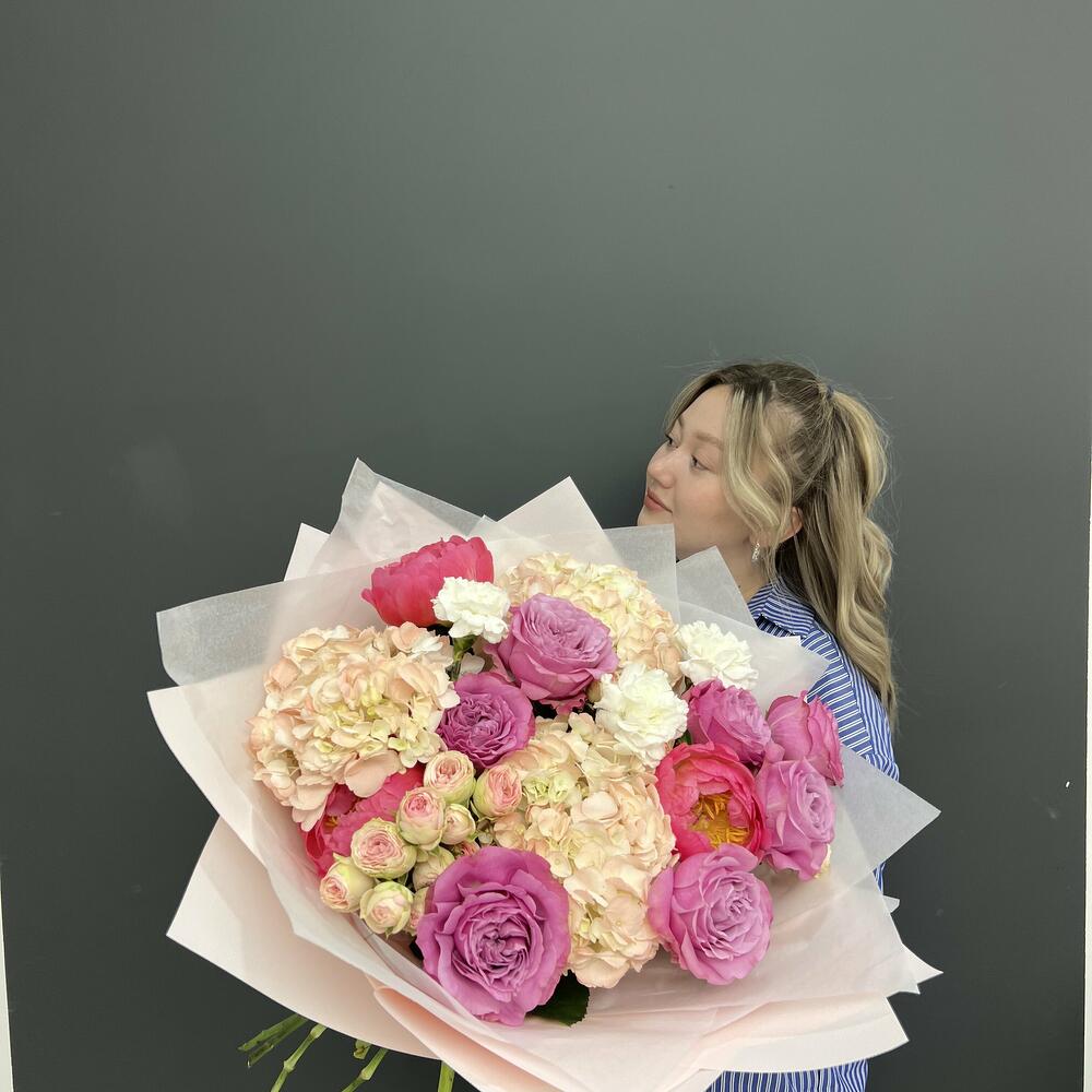 Альстромерии, Гортензии, Кустовые розы, Лизиантусы, Розы, Хризантемы