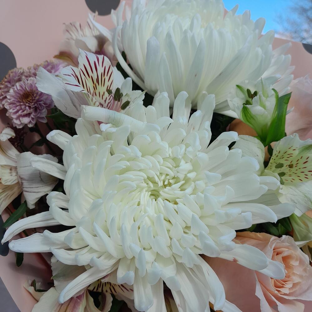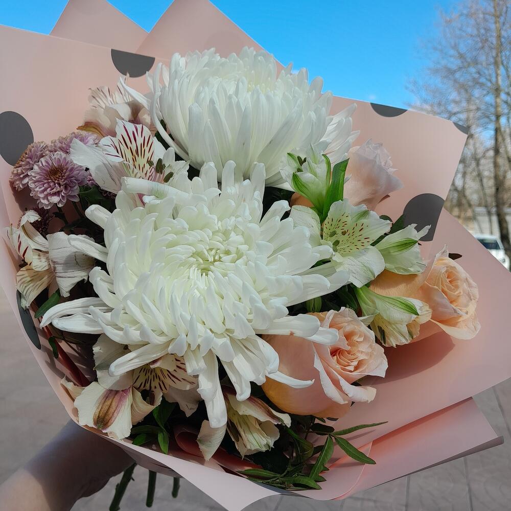 Альстромерия – 3 шт.Хризантема кустовая – 1 шт.Роза – 3 шт.Хризантема – 2 шт.Лента атласная – 2 шт.Фисташка – 2 шт.Упаковка дизайнерская – 2 шт.