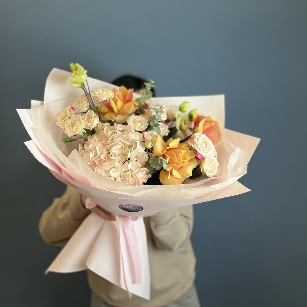 Альстромерии, Гортензии, Кустовые розы, Лизиантусы, Розы, Хризантемы
