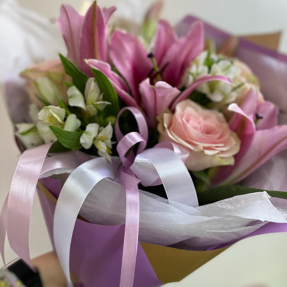 Альстромерия – 5 шт.Роза – 5 шт.Упаковка – 5 шт.Тишью белое – 6 шт.фисташка зелень – 9 шт.ленты атласные – 8 шт.лилия ароматная ветка – 2 шт.