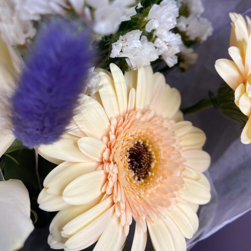 Упаковка – 1 шт.Статица белая – 1 шт.Ирис Blue Magic – 2 шт.Роза белая мондиаль – 1 шт.Мини гербера – 3 шт.Лагурус (сухоцвет) – 4 шт.лизиантус розита вайт – 1 шт.