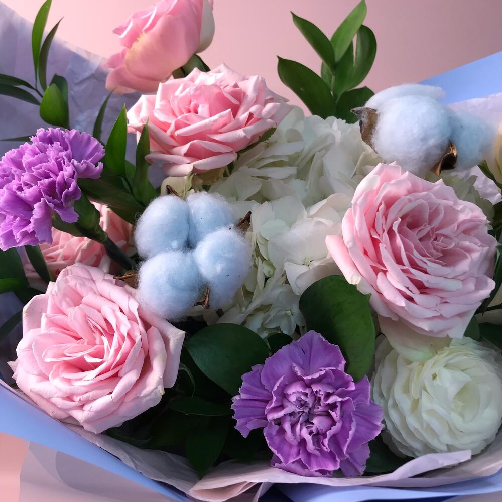 Гортензия – 1 шт.Рускус – 7 шт.Салал – 7 шт.Тишью – 4 шт.Ранункулюс – 1 шт.Роза садовая – 3 шт.Оформление – 1 шт.хлопок сухоцвет – 2 шт.ковыль сухоцвет – 1 шт.Диантус мун аква – 2 шт.Пион Италия – 1 шт.