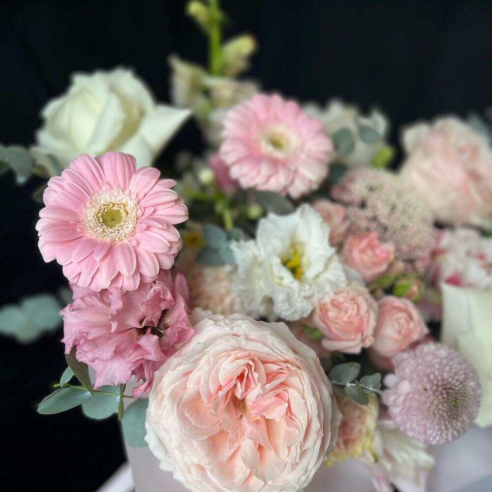 Пионовидная роза – 5 шт.Кустовая роза – 3 шт.Тюльпан пионовидный – 3 шт.Хризантема – 2 шт.Гербера – 3 шт.Лизиантус – 4 шт.Озотамнус – 2 шт.антиринум – 2 шт.Эвкалипт – 3 шт.Шляпная коробка – 1 шт.Флористическая губка (оазис) – 1 шт.Атласная лента – 1 шт.