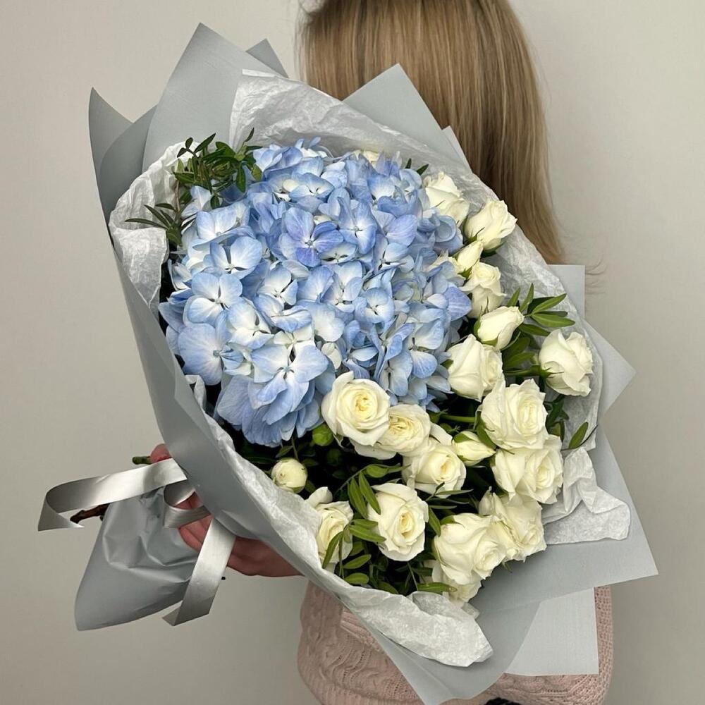 Гортензия – 1 шт.Роза кустовая – 5 шт.Фисташка – 4 шт.Упаковка дизайнерская – 4 шт.