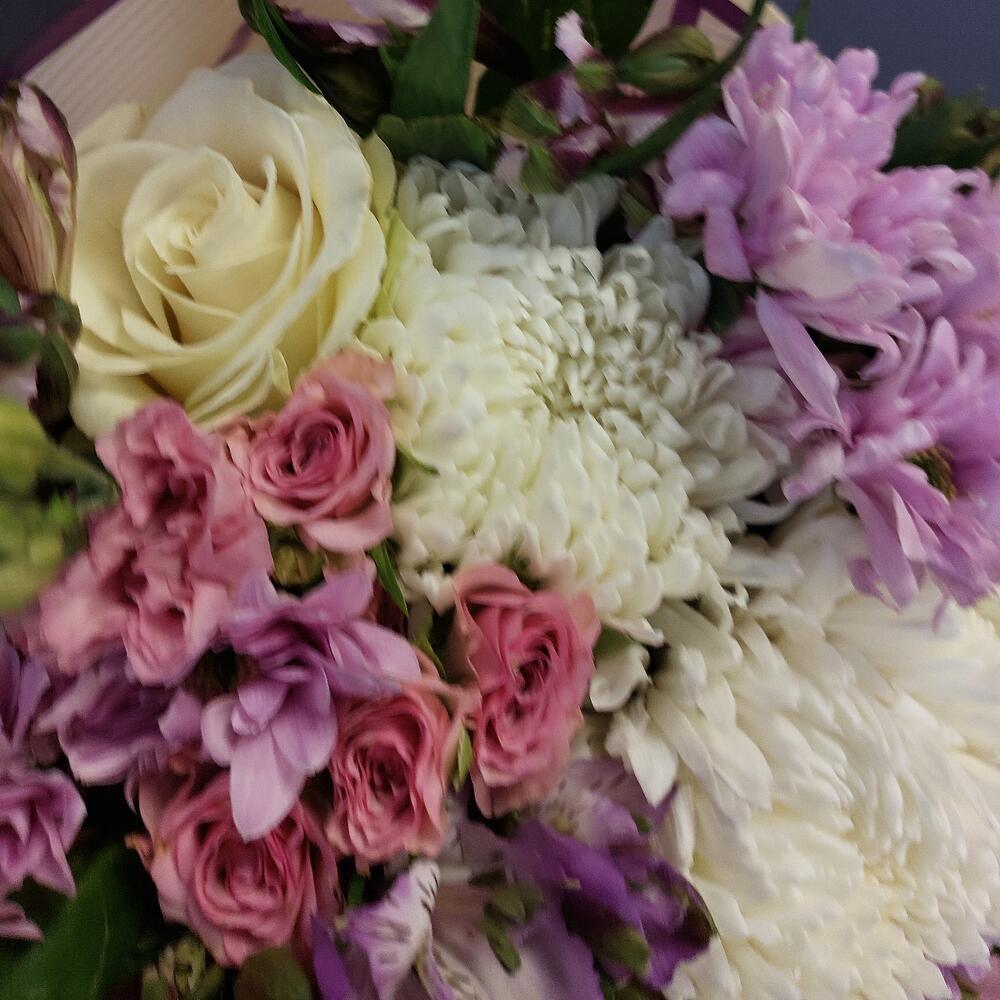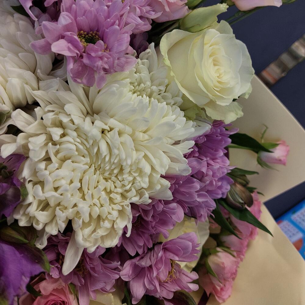 Кустовая роза – 4 шт.Роза – 5 шт.Эустома – 4 шт.Хризантема кустовая – 5 шт.Хризантема одноголовая белая – 3 шт.Альстромерия – 6 шт.Упаковка дизайнерская – 4 шт.Лента атласная – 2 шт.