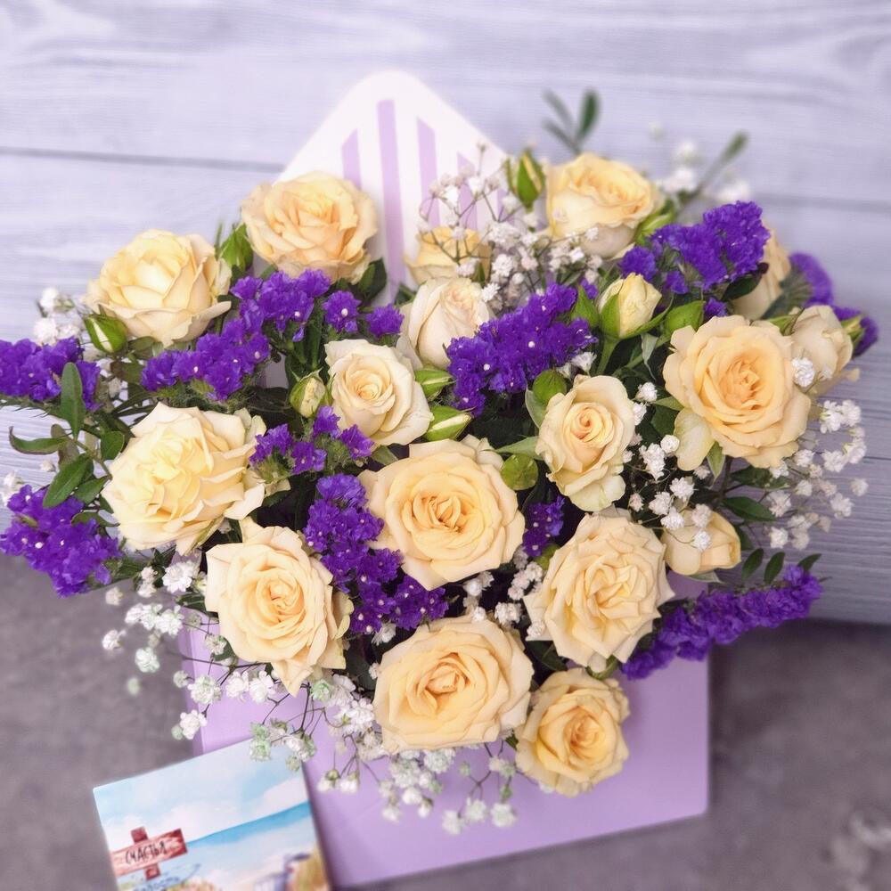 Фисташка – 3 шт.Статица синяя – 2 шт.Открыточка с вашими пожеланиями – 1 шт.Оазис флористический – 1 шт.конверт картонный – 1 шт.гипсофила белая – 1 шт.роза кустовая солинейро – 5 шт.