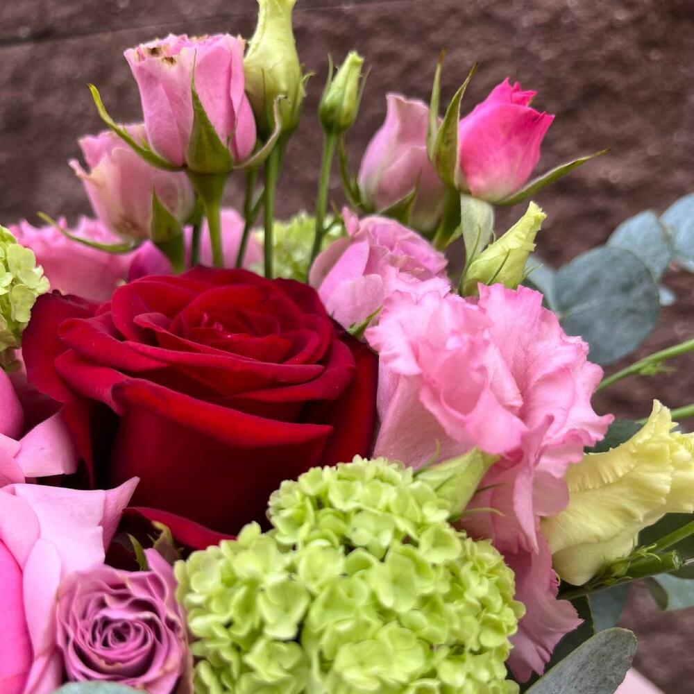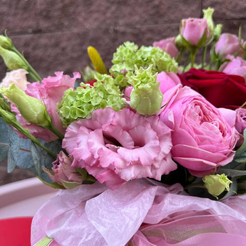 Альстромерии, Гортензии, Кустовые розы, Лизиантусы, Розы, Хризантемы