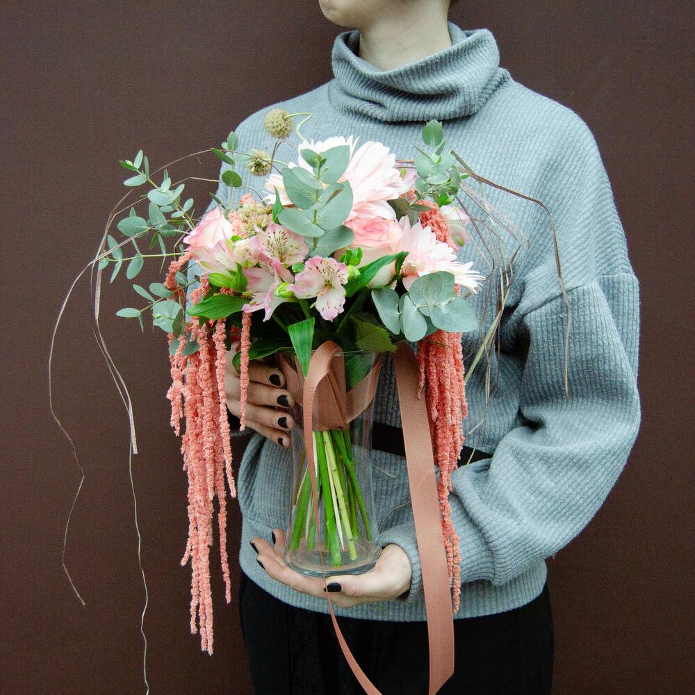 Альстромерии, Гвоздики, Кустовые розы, Лизиантусы, Розы, Хризантемы