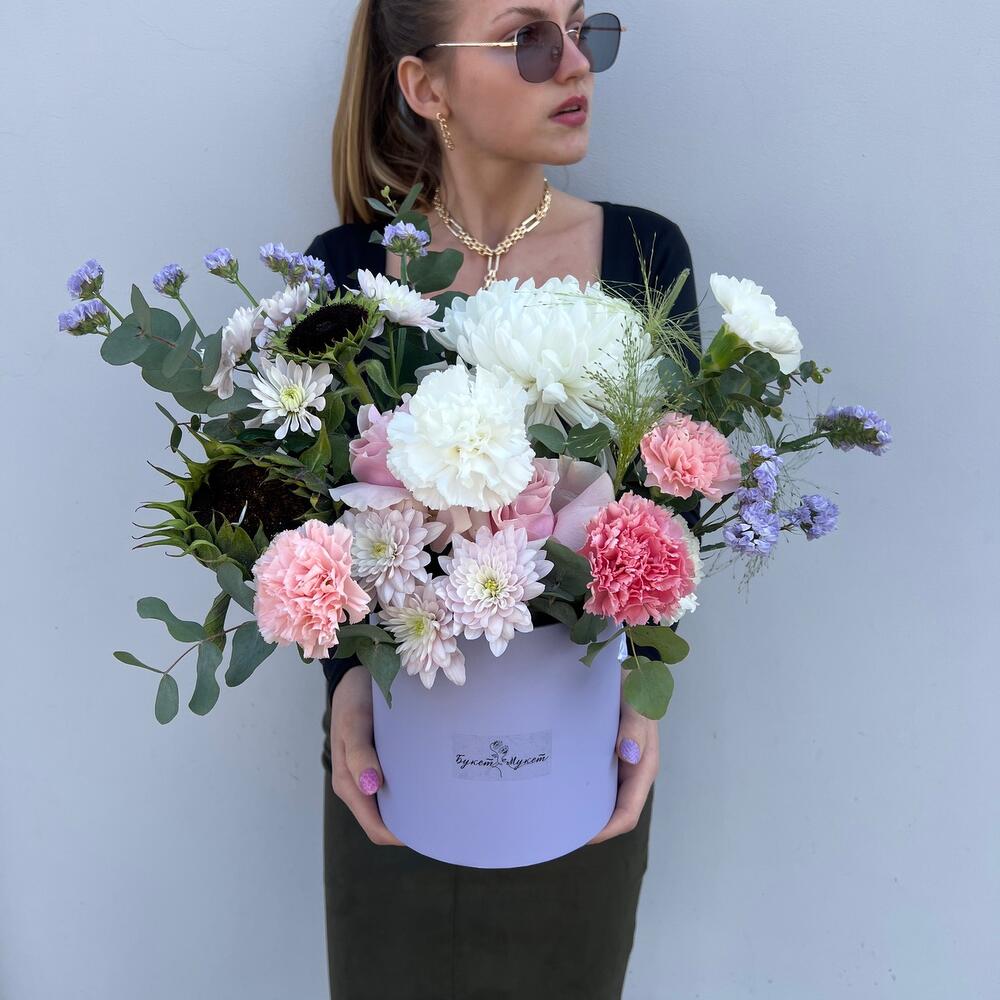 Хризантема Антонов – 1 шт.Диантус – 6 шт.Роза французская – 2 шт.Подсолнух – 2 шт.Паникум – 2 шт.Хризантема Балтика – 1 шт.Статица – 1 шт.Эвкалипт – 1 шт.Оазис флористический – 1 шт.Коробка шляпная – 1 шт.