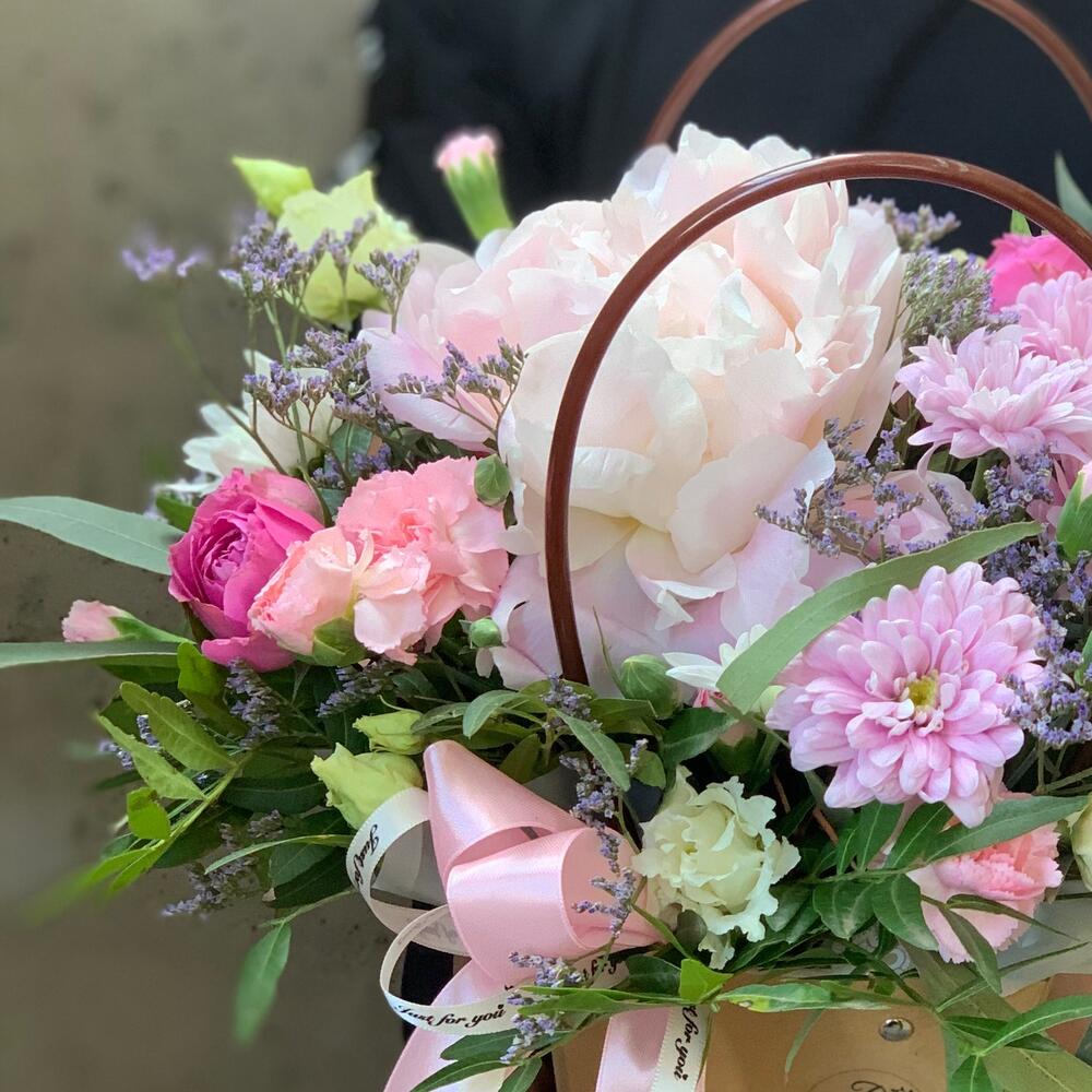Крафт – 1 шт.Пион – 1 шт.Хризантема кустовая – 1 шт.Роза кустовая – 2 шт.Гвоздика – 3 шт.Гвоздика кустовая – 1 шт.Эустома – 1 шт.Лимониум – 1 шт.зелень декоративная – 1 шт.