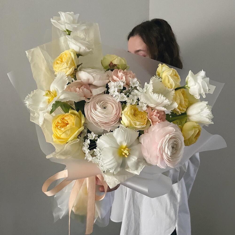 Категорий: Гвоздики, Кустовые розы, Лизиантусы, Пионовидные розы, Розы, Тюльпаны