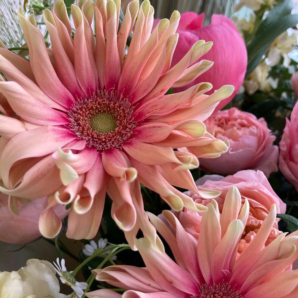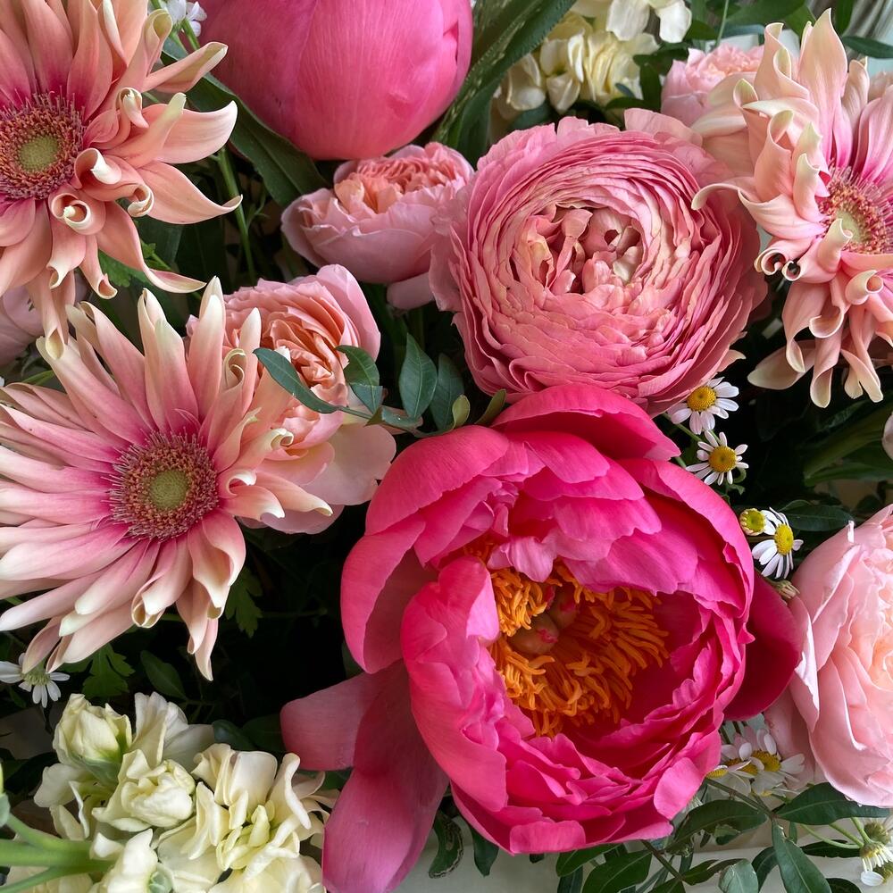 Пион – 2 шт.Роза кустовая пионовидная – 1 шт.матилла – 5 шт.гербера кучерявая – 3 шт.паникум грас – 3 шт.Ромашка кустовая – 2 шт.Фисташка – 3 шт.Упаковка дизайнерская – 1 шт.Лента атласная – 1 шт.