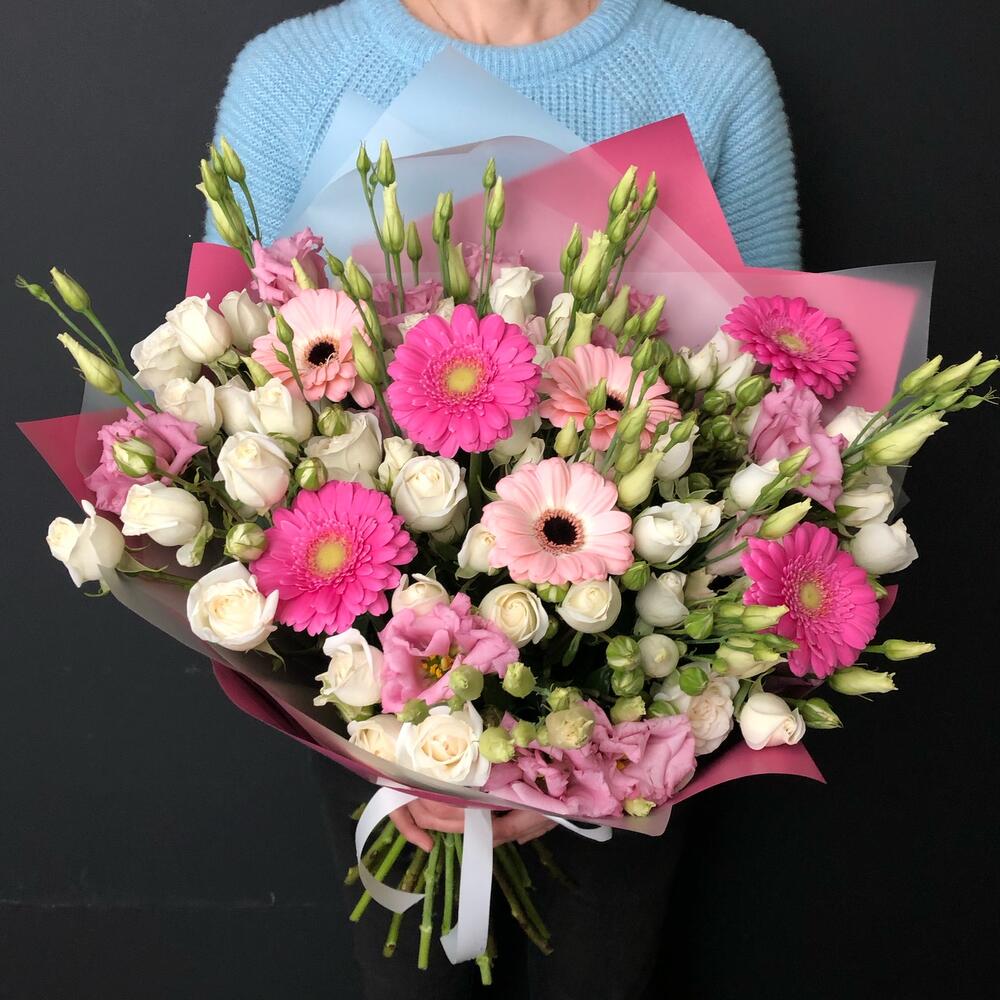 Роза – 9 шт.Лизиантус – 3 шт.Гербера мини – 7 шт.Упаковка дизайнерская – 3 шт.