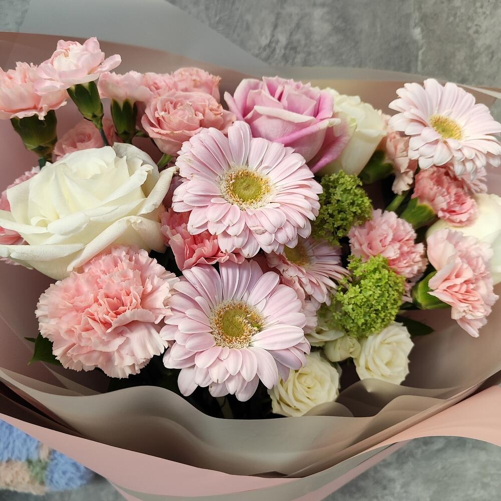 Гербера – 5 млРоза кустовая пионовидная – 1 шт.Роза кустовая – 1 шт.Гвоздика сортовая – 9 шт.Гвоздика кустовая – 2 шт.Роза Венделла – 1 шт.Роза белая 60 см – 2 шт.Вибурнум – 1 шт.Рускус – 6 шт.Авторская упаковка – 1 шт.Атласная лента – 1 шт.