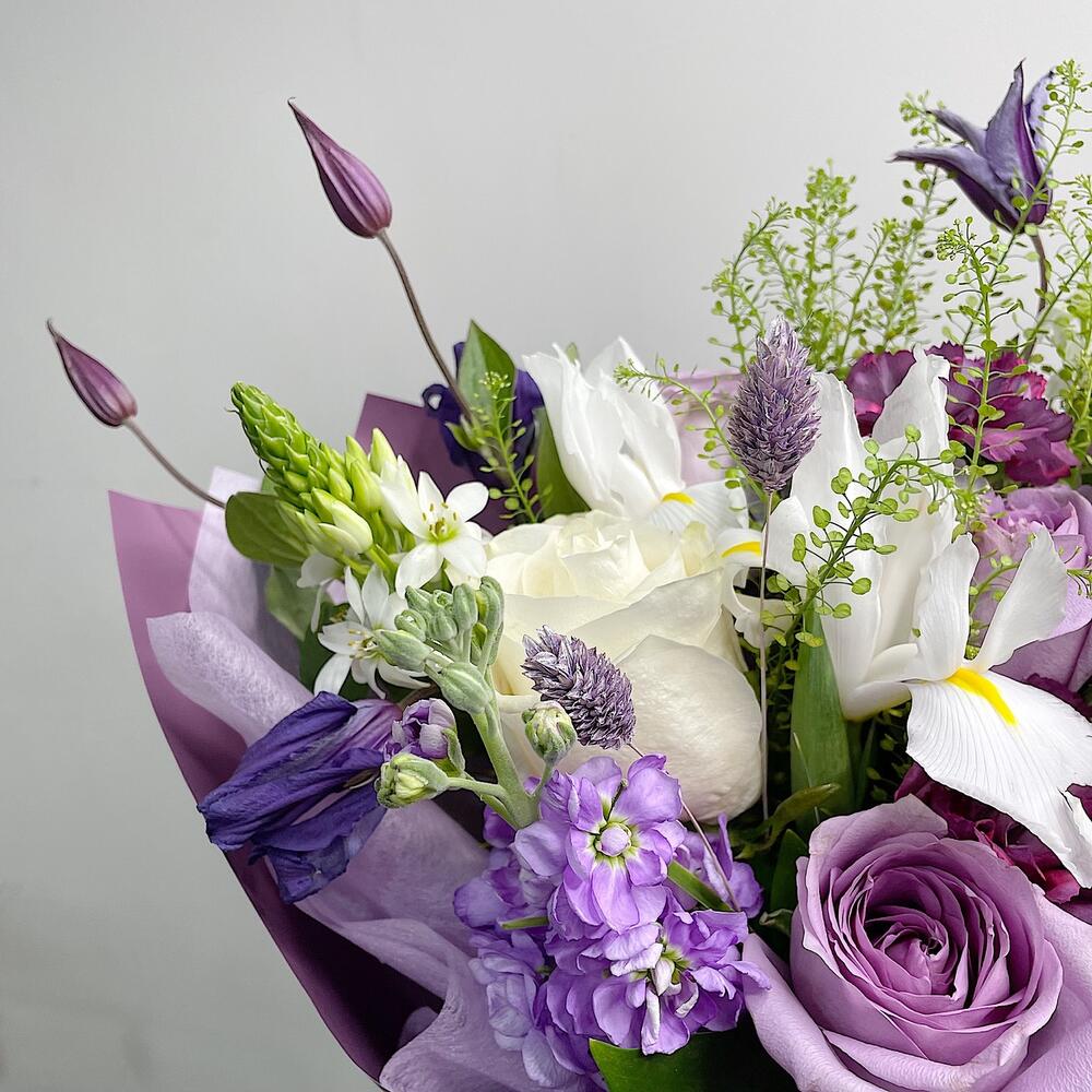 Ирис – 2 шт.Тласпи – 2 шт.Хризантема кустовая – 1 шт.Диантус – 3 шт.Орнитогалум – 2 шт.Роза сиреневая – 3 шт.Клематис – 2 шт.Фаларис – 3 шт.