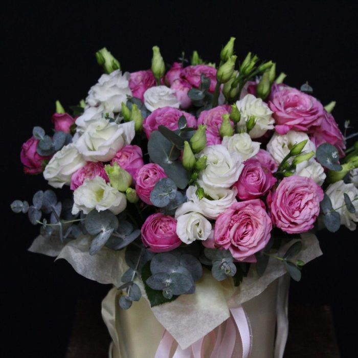 Пионовидная кустовая роза – 7 шт.эустома белая – 5 шт.Коробка шляпная – 1 шт.Оазис флористический – 1 шт.Эвкалипт Baby Blue – 5 шт.Лента атласная – 3 шт.