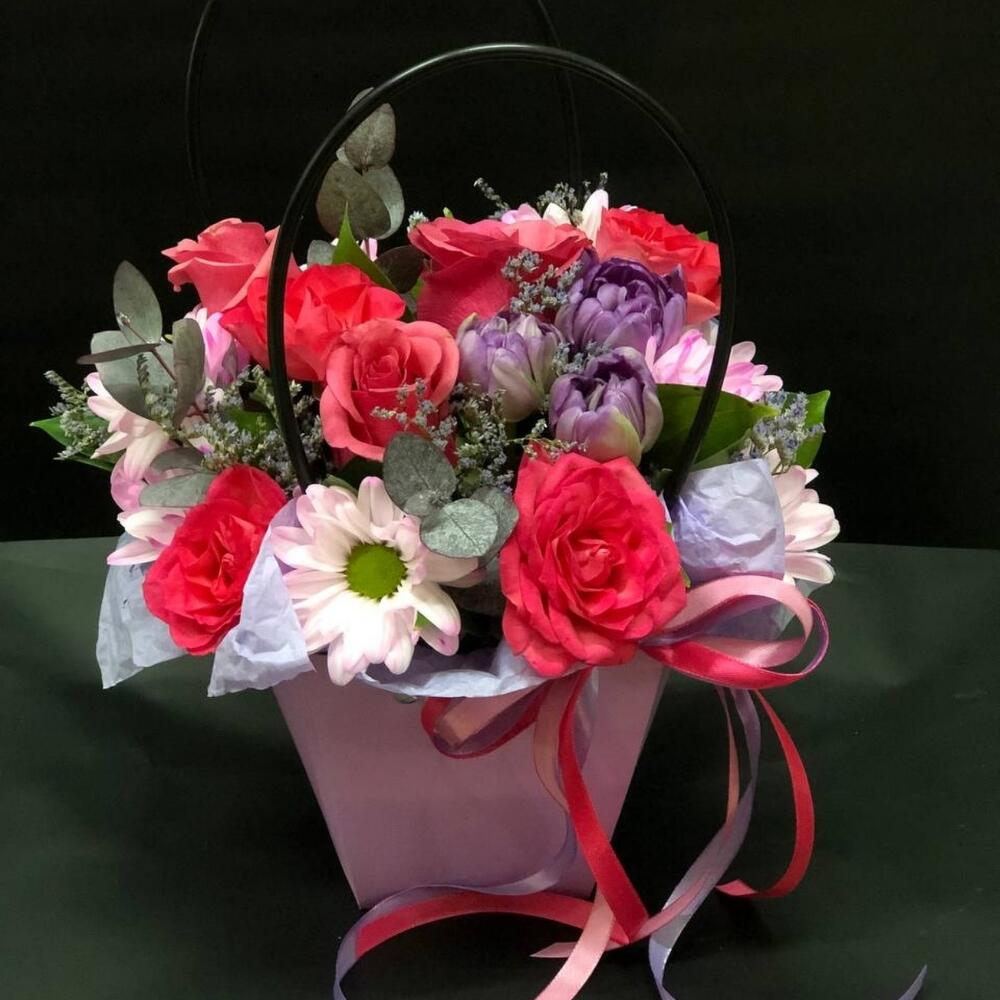 Рускус – 3 шт.Роза – 3 шт.Тюльпан – 3 шт.Роза кустовая – 2 шт.Сумочка – 1 шт.Хризантема кустовая – 1 шт.Оазис флористический – 1 шт.Лимониум – 1 шт.эвкалипта – 1 шт.