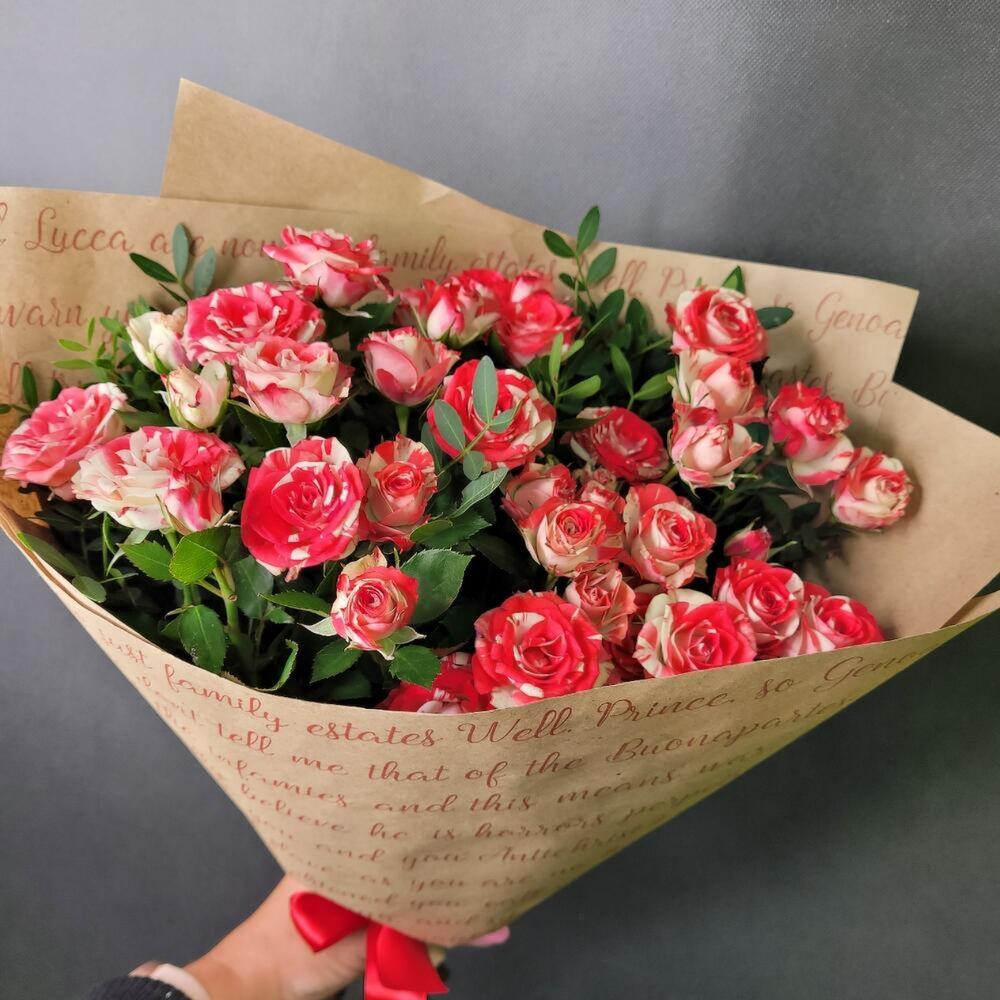 Роза кустовая – 5 шт.Лента атласная – 1 шт.Фисташка – 2 шт.Упаковка крафт – 1 шт.