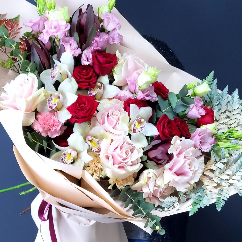 левкадендрон – 3 шт.Лизиантус – 5 шт.Орхидея Цимбидиум – 6 шт.Папоротник – 3 шт.Эвкалипт – 5 шт.Роза – 9 шт.Роза Эквадор – 6 шт.Гвоздика – 5 шт.Фисташка – 7 шт.Упаковка дизайнерская – 1 шт.