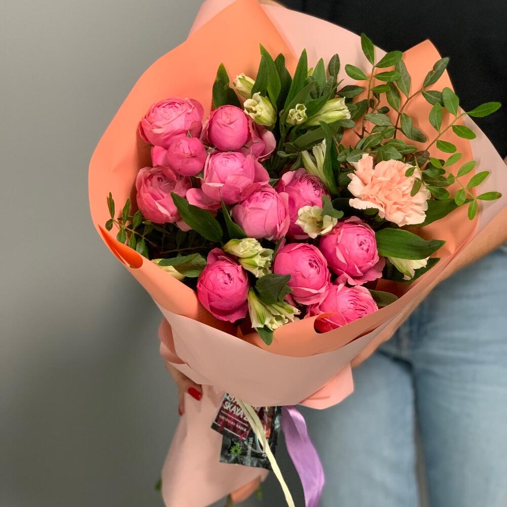 кустовая пионовидная роза сильвия пинк – 2 шт. Альстромерия – 3 шт. Гвоздика – 1 шт. Писташ – 1 шт.