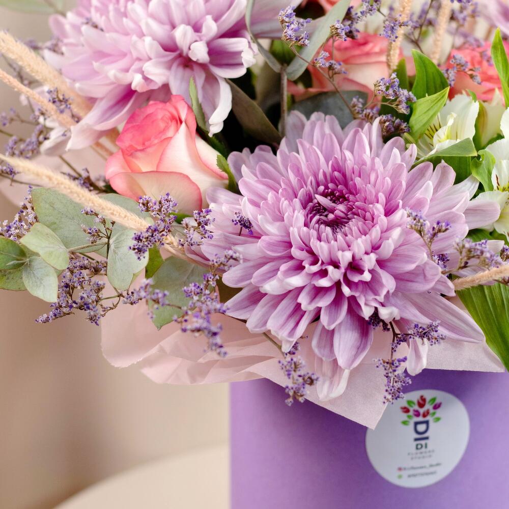 Хризантема – 3 шт. Роза – 3 шт. Альстромерия – 3 шт. Гвоздика – 3 шт. Лимониум – 1 шт. Флум – 1 шт. Эвкалипт – 1 шт.