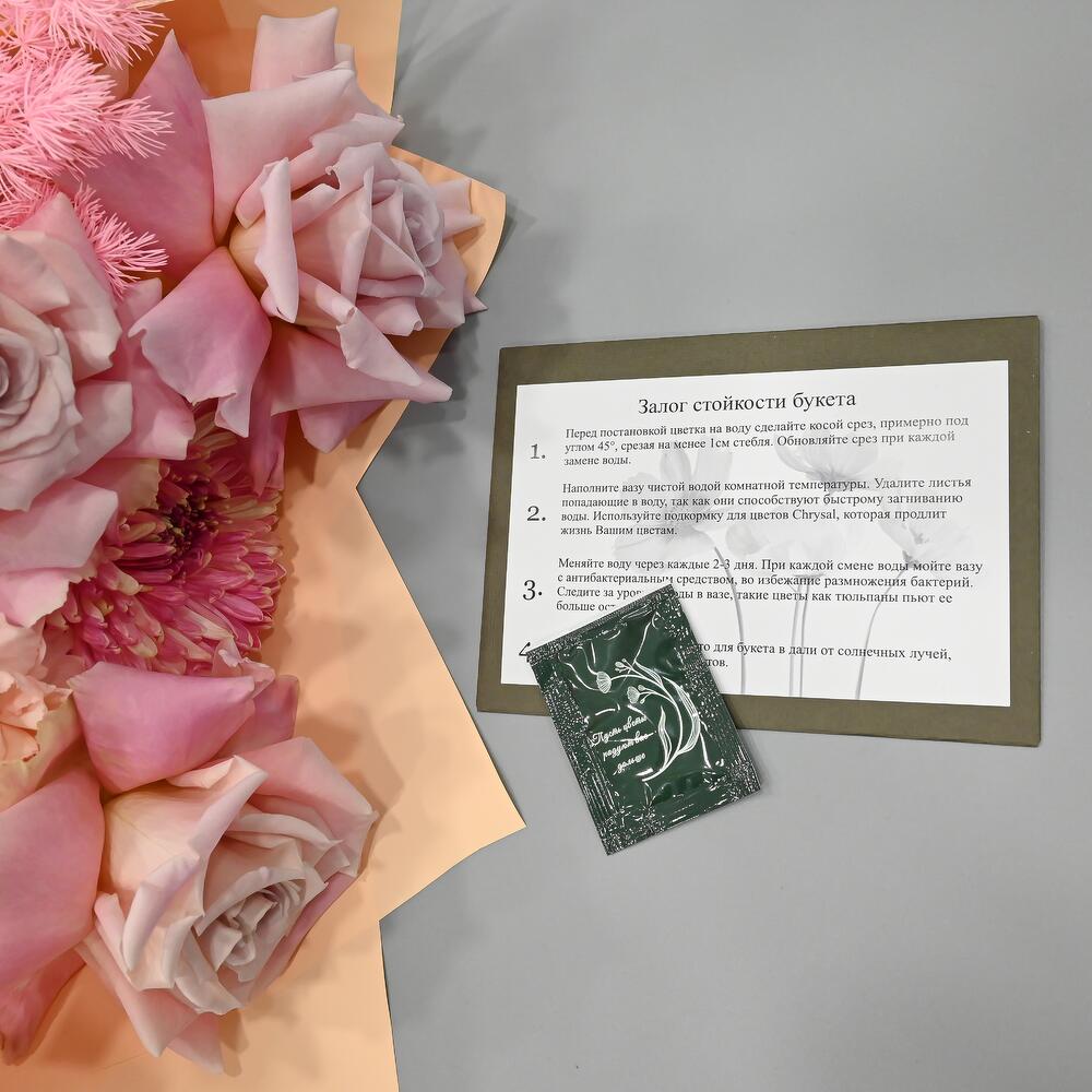 Нежный букет в бело розовой цветовой гамме. В составе французские розы, сортовая гвоздика и хризантема.Флористы студии Цветочный Этикет собрали его из самых свежих цветов, тщательно продумав состав. Букет готов удивлять красотой своего получателя! Станет идеальным подарком … Показать ещёдля любимой женщины, дочке или мамы, на День Рождения, юбилей, свадьбу и другие торжественные мероприятия. С букетом вы получите конверт с открыткой, в которой мы напишем любое пожелание, инструкцию свежести и средство для продления жизни срезанных цветов.