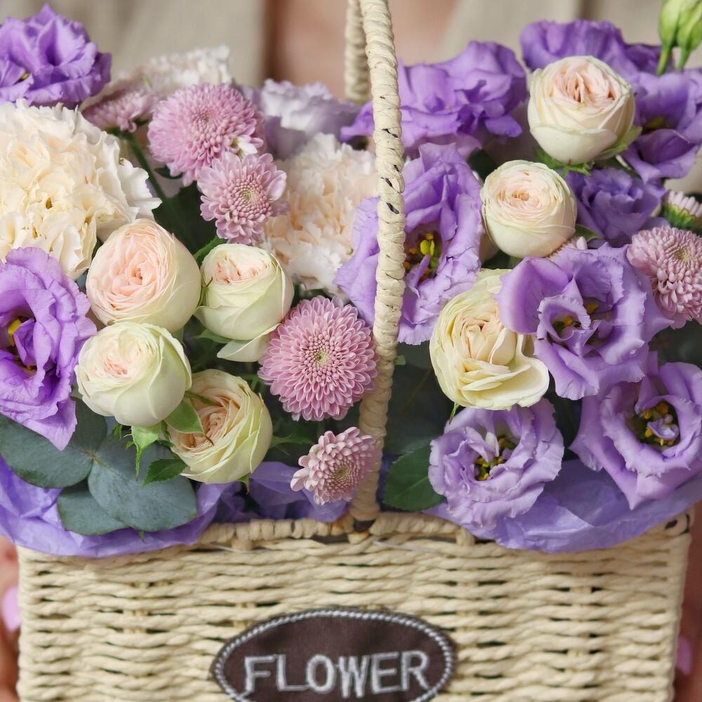 Сиреневая композиция в корзине с розами и эустомой