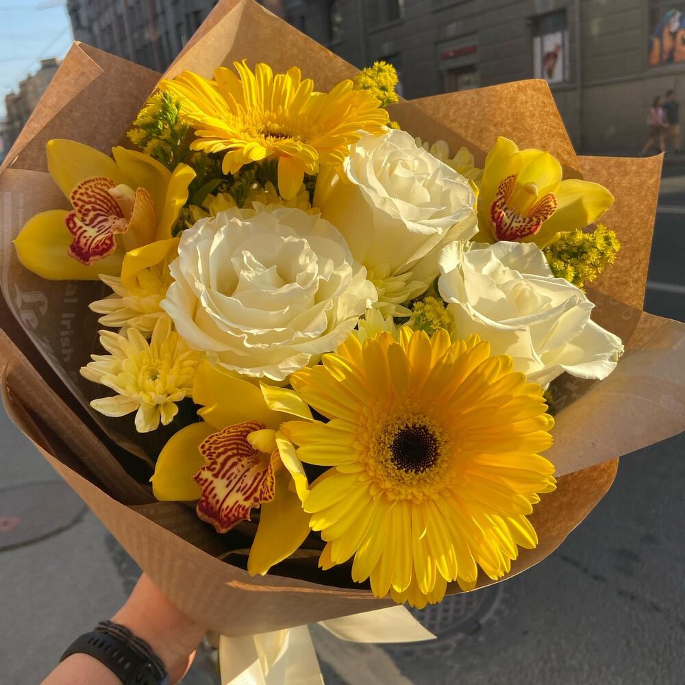 Гербера – 2 шт.Орхидея Цимбидиум – 3 шт.Рускус – 5 шт.Роза Эквадор – 3 шт.Солидаго – 3 шт.Хризантема кустовая – 2 шт.Упаковка дизайнерская – 5 шт.Лента атласная – 1 шт.