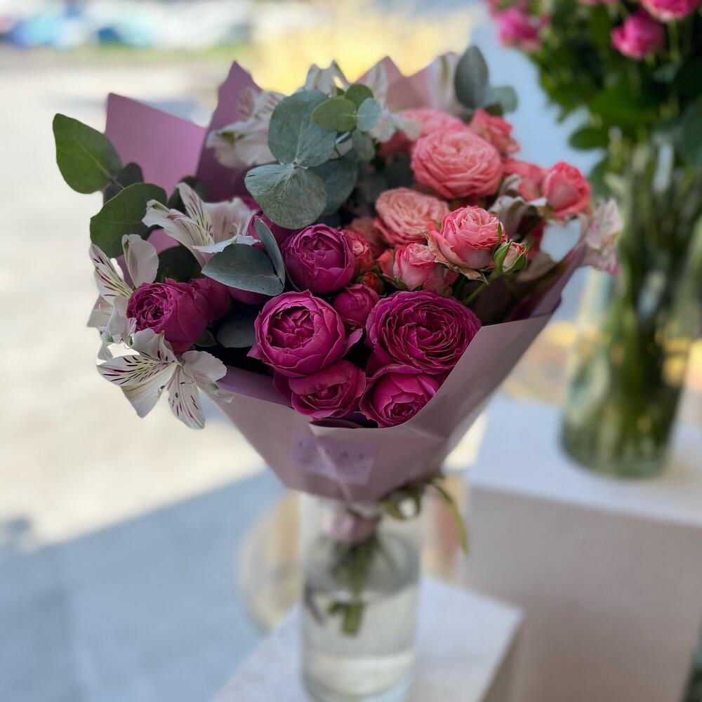 Альстромерии, Гвоздики, Кустовые розы, Лизиантусы, Розы, Хризантемы