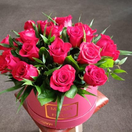 Хризантема кустовая – 4 шт. Зелень – 3 шт. Гербера – 1 шт. Шляпная коробка – 1 шт. Роза кустовая пионовидная – 1 шт. Роза одноголовая местная 50 см – 4 шт.