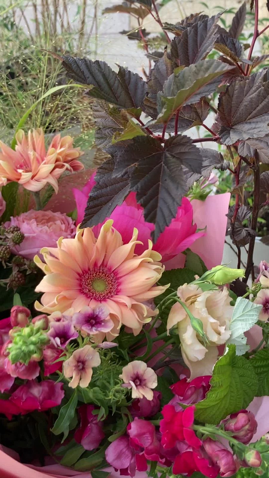 Авторский букет с ежевикой, пионами, душистой маттиолой, флоксами, львиным зевом, садовыми розами, кучерявыми герберами, ветками малины и травами.