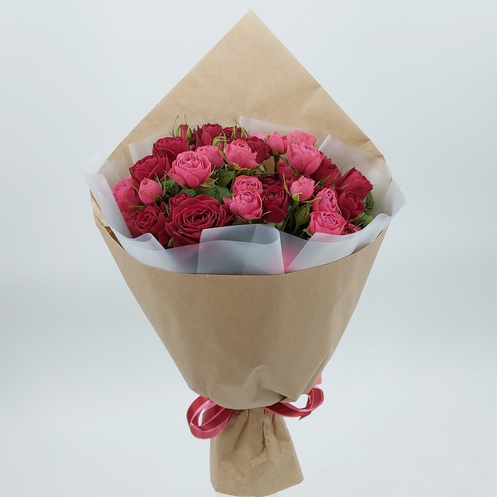 Лента атласная – 2 шт.Упаковка пленка матовая – 1 шт.Упаковка крафт – 1 шт.роза кустовая премиум – 9 шт.
