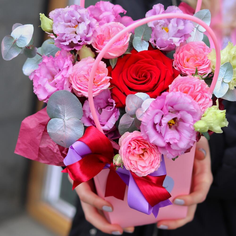 Яркий комплимент: яркие цветы в сумочке (лизиантус, красная роза, пионовидная кустовая роза”